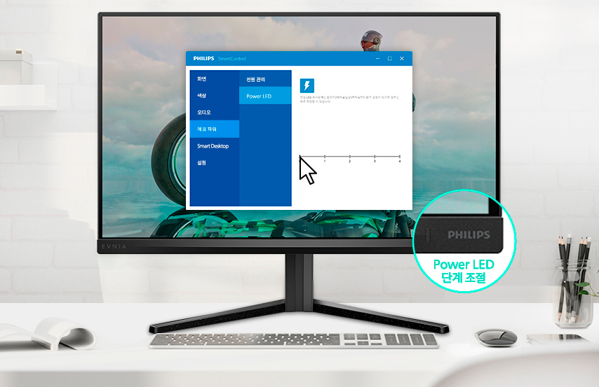 필립스는 사용자 편의를 고려한 전용 소프트웨어를 제공합니다. 이 소프트웨어를 통해 모니터 설정을 마우스로 쉽게 조정할 수 있으며, 화면을 분할하여 멀티태스킹을 더욱 효율적으로 할 수 있습니다. 또한, 전원 표시등의 밝기를 0에서 4단계까지 조절할 수 있어 어두운 환경에서도 눈부심을 최소화할 수 있습니다.