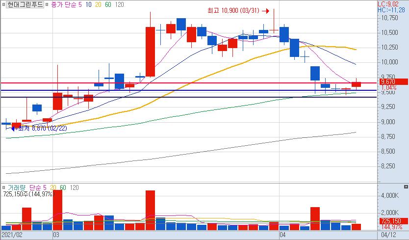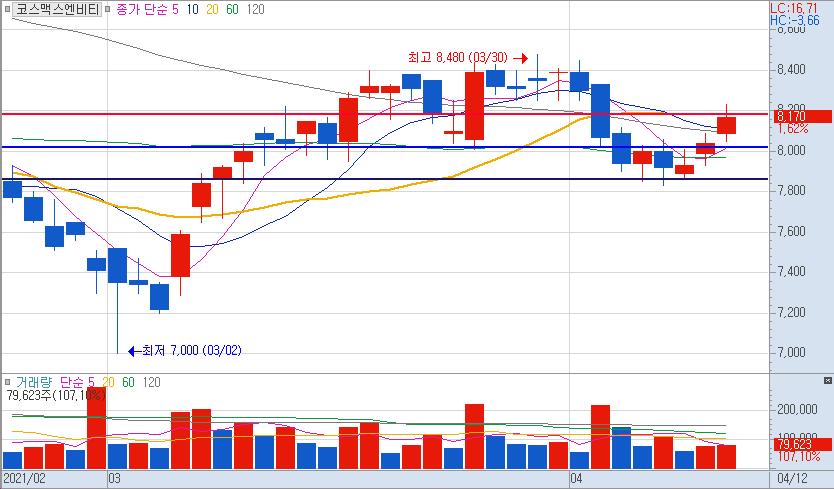 일봉상 3/11 20일선 아래로 내려간 후 약한흐름 이어지자 4/5 바닥찍고 60일선 지지 받으며 상승 시도, 최근 2거래일 연속상승 20일선 돌파 시도