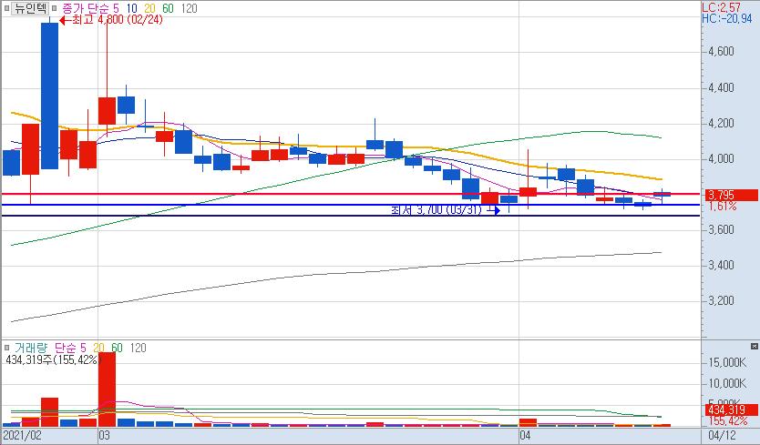 일봉상 3/31 고점찍고 연속하락 후 최근 4거래일 보합세 유지, 60일선 지지 받으며 약한 흐름이지만 상승흐름 전환 중