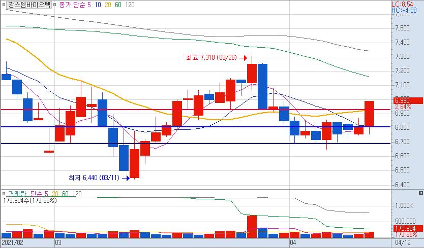 일봉상 4/7 20일선 아래로 내려갔으나 크게무너지지 않고 60일선 지지받으며 최근 2거래일 연속상승 오늘장 20일선 근접