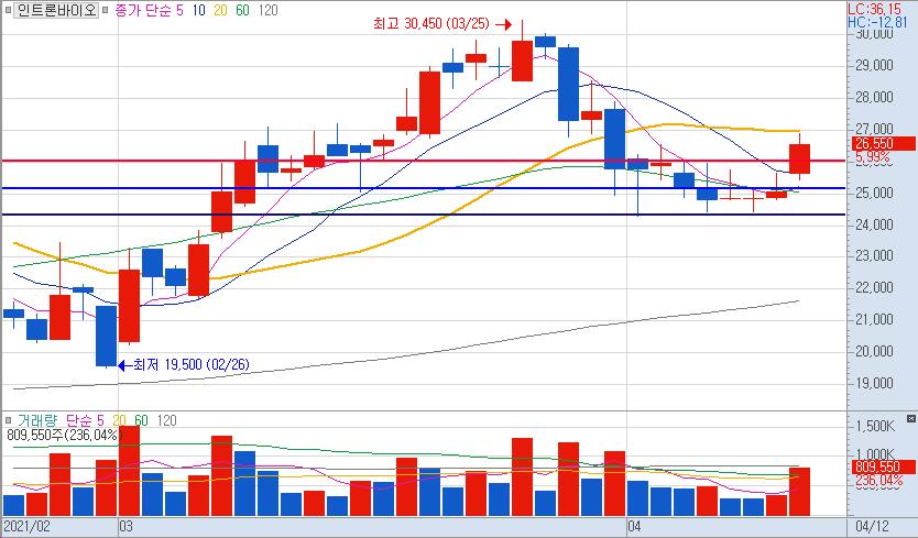 일봉상 3/29 하락추세 전환 20일선 아래로 내려갔으나 최근 잠시 횡보후 2거래일 연속상승 오늘장 20일선 돌파시도