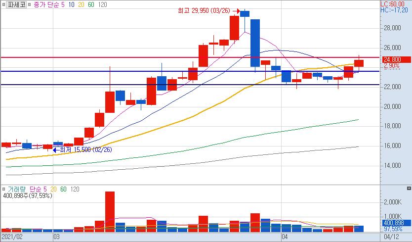 일봉상 4/2 잠시 조정받으며 20일선 아래로 내려갔으나 2거래일 연속 상승하며 오늘장 거래량 붙으며 20일선 돌파